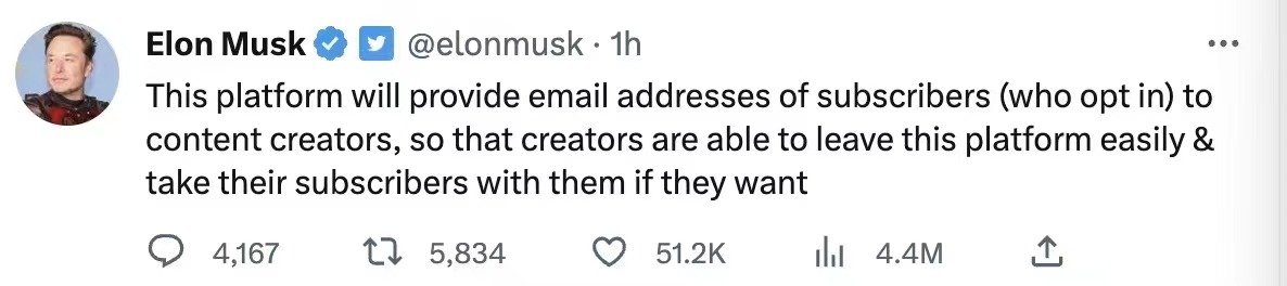 6月7日消息,马斯克今日发布推文,称Twitter将向内容创作者提供订阅者的电子邮件地址。马斯克称,此举是为了让创作者能够轻松离开该平台并在需要时带走他们的订阅者。值得一提的是,今日早些时候,琳达・雅克里诺(Linda Yaccarino)发布推文,宣布正式出任Twitter首席执行官一职,执掌该社交平台未来的发展。