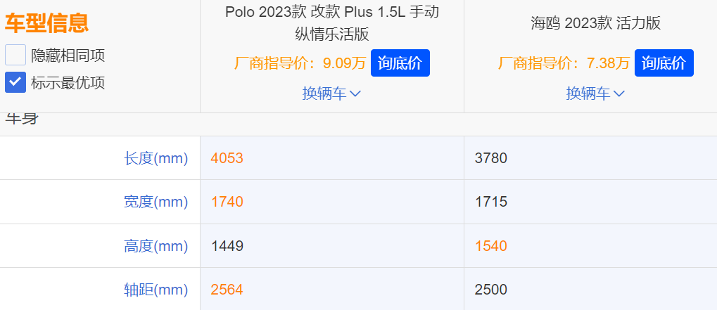 以 Polo 和比亚迪海鸥为例,两车轴距相差 64mm ,基本在同一水平,但海鸥的车长比 Polo 短了有 273 mm 。