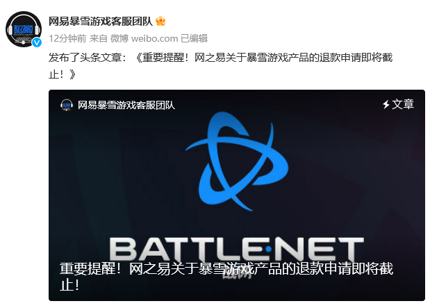 今日(6月8日),网易暴雪游戏客服团队官方公布《重要提醒!网之易关于暴雪游戏产品的退款申请即将截止!》,暴雪游戏产品提交退款申请的截止日期为2023年6月30日,未在截止日期前完成退款申请的玩家将被视为主动放弃相关权益。