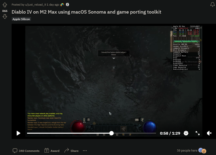 而另一位用户 just_reload_1则成功的在 M2 Max 芯片的 macOS Sonoma 系统上运行了《暗黑破坏神4》。明显可见的是 M2 芯片要比 M1 好得多,而且根据此前《暗黑破坏神4》的性能测试,也表明这款游戏的优化比《2077》好很多。因此游戏能够在 1512x982分辨率下以 80 至 90 FPS 流畅运行。