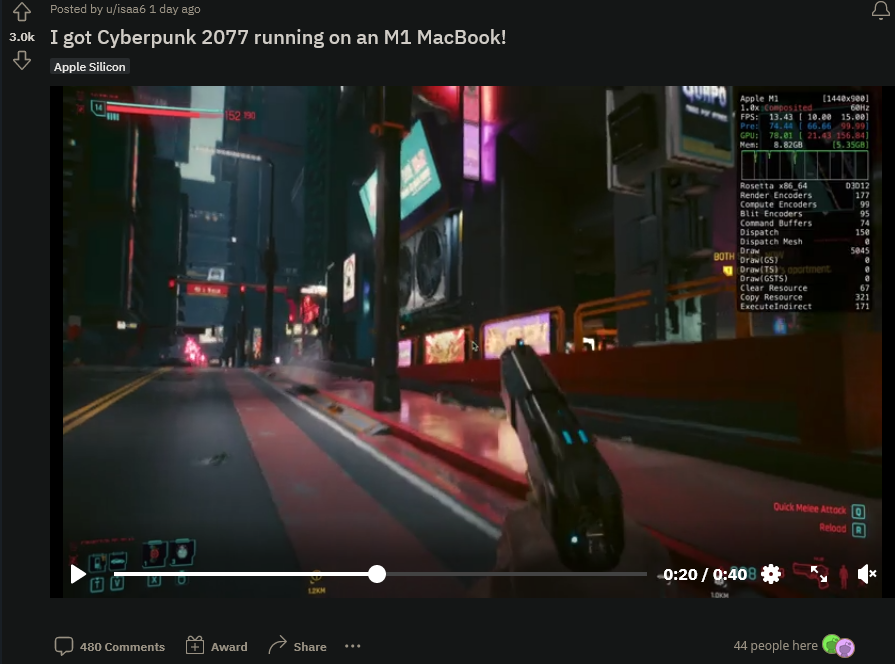 Reddit 论坛专注于在 Mac 设备上游玩游戏的 Macgaming 分版用户 isaa6 成功的在配备了 M1 芯片的 MacBook 笔记本电脑上运行了《赛博朋克2077》。在所有设置全部最高,1440x900 分辨率情况下,游戏帧数并不高,仅在 14FPS 左右。