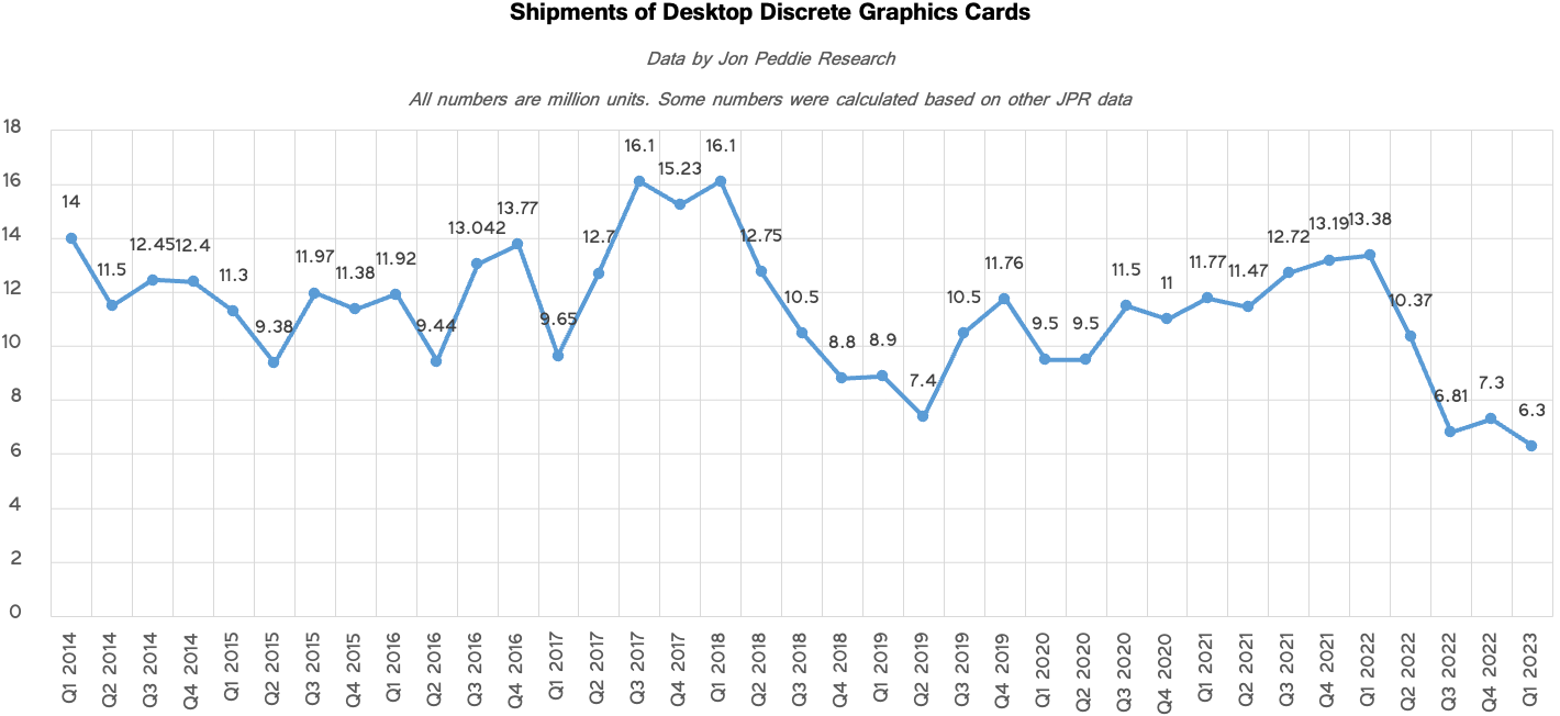 根据市调机构Jon Peddie Research的最新数据,2023年第一季度,全球独立显卡销量仅为630万块,环比下跌12.6%(过去十年平均跌幅4.9%),同比锐减38.2%。最近十年,独立显卡市场还从来没有如此糟糕,相比去年第三季度的680万块更进一步滑向深渊。