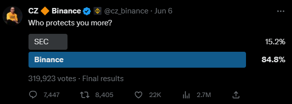 就连赵长鹏自己也带头冲锋,在推特上发起了币安和 SEC 谁更保护用户的投票。