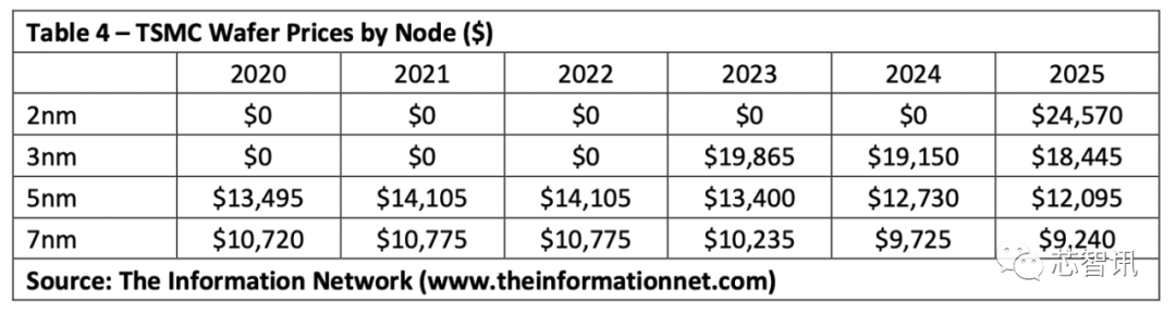 这里可以看到,前一张图表当中,2020年之时5nm晶圆的代工报价为16988美元每片晶圆,而The Information Network的图表中,2020年之时5nm晶圆的代工报价为13486美元每片晶圆,二者之间存在着一定的差异。