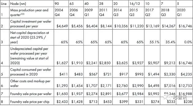 需要指出的是,这里所说的仅仅只是加工成本,其他还有像半导体硅片等材料、半导体设备(折旧)、人力、工厂基础设施建设(折旧)、水电等诸多方面的成本(上面图表中将其与台积电的加价放在了一起,并未单列)。从图表来看,台积电的折旧是按照每年大约25%来进行折旧,大约4年完成折旧。