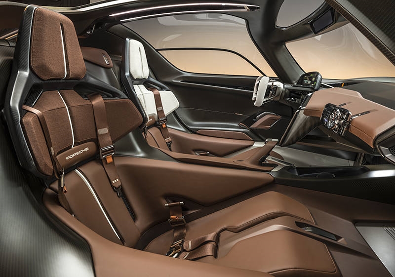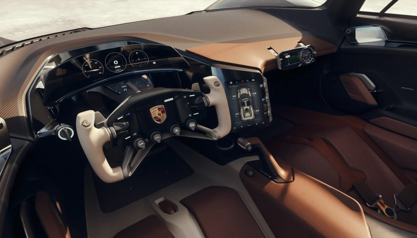 另一个亮点位于乘客侧,仪表板内嵌有卡口系统,可连接计时码表模块。保时捷设计公司打造了一个特殊的计时码表模块,具有模拟和数字两种显示模式。计时码表专为赛道和拉力赛设计,可以显示圈速或车手的生理数据,以及其他信息。