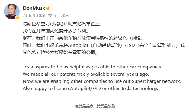 就在今日,马斯克发布微博称:特斯拉希望尽可能地帮助其他汽车企业,我们在几年前就免费开放了专利。现在,我们正在向其他车辆开放使用特斯拉的超级充电网络;同时,我们也很乐意将Autopilot(自动辅助驾驶)/FSD(完全自动驾驶能力)或其他特斯拉技术授权给有需要的公司。