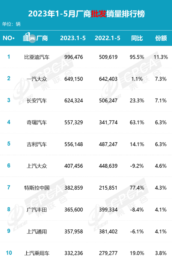 而如果看今年前五个月的累计批发销量排名的话,那么情况又有所不同。在这份榜单中,比亚迪汽车、一汽大众、长安汽车、奇瑞汽车、吉利汽车、上汽大众、特斯拉中国、广汽丰田、上汽通用和上汽乘用车则是排名前十的厂商。