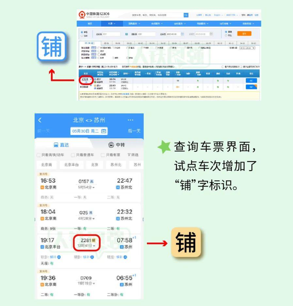 中国铁路官方今天宣布,正式开始试行12306网站(含手机客户端)的选铺服务。今日起,旅客可在铁路12306网站或APP自主选择购买试点车次卧铺车票。为了方便大家查看哪些列车支持选铺,官方在车票查询界面增加了“铺”字表示,可以非常方便的一眼找到。