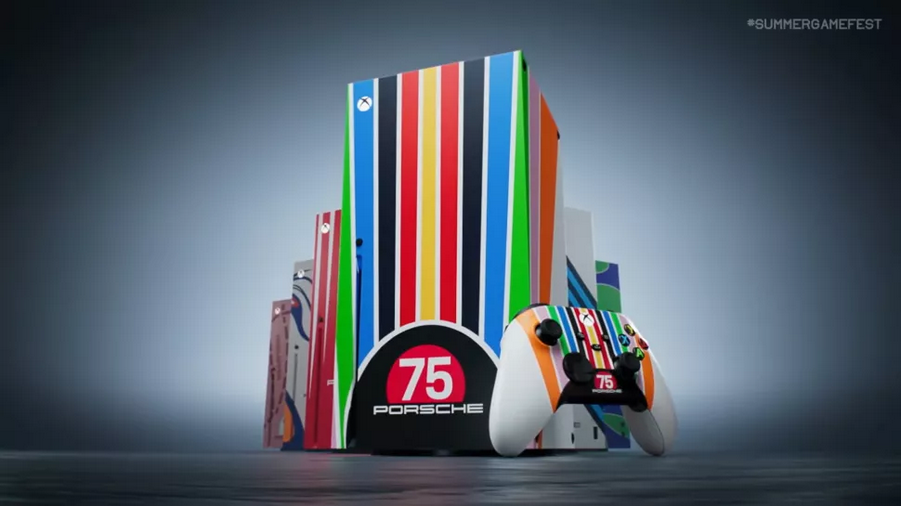 在昨天(6 月 9 日)举办的夏日游戏节上,保时捷和微软公布了一系列联名 Xbox SeriesX 主机。该系列主机庆祝了这家车厂的 75 周年。这些主机中的一款在夏日游戏节的主舞台上进行了展示。在主视觉图的背景中还能看到其他一些设计。
