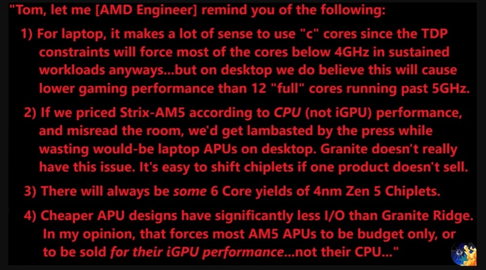 AMD近日证实,对AM5接口/插槽的支持至少会持续到2026年。同时,锐龙8000系列家族中将包含Strix Point桌面APU。对此,爆料大神MLID给出消息,锐龙8000桌面APU将仅提供Zen5 CPU核,工作频率超5GHz。出于游戏性能考虑,不会采用Zen5c。