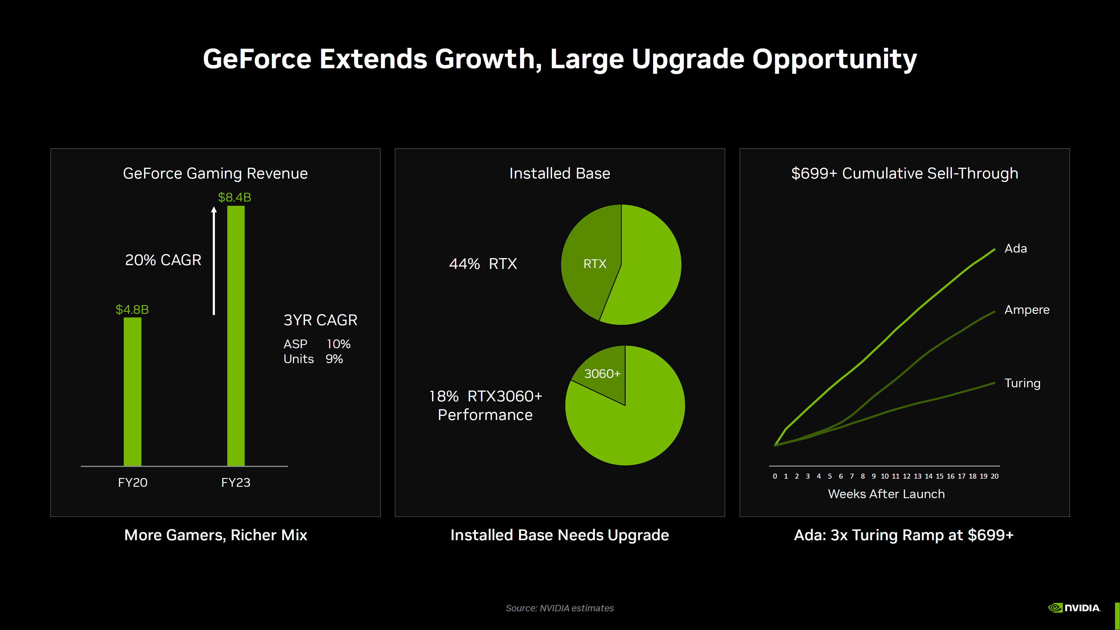 Turing RTX 20/GTX 16系列、Ampere RTX 30系列、Ada RTX 40系列三代一路发展下来,赚钱能力也是越来越强,同样是发售后20周的时间里,RTX 40系列带来的收入比RTX 30系列高了多达40%。