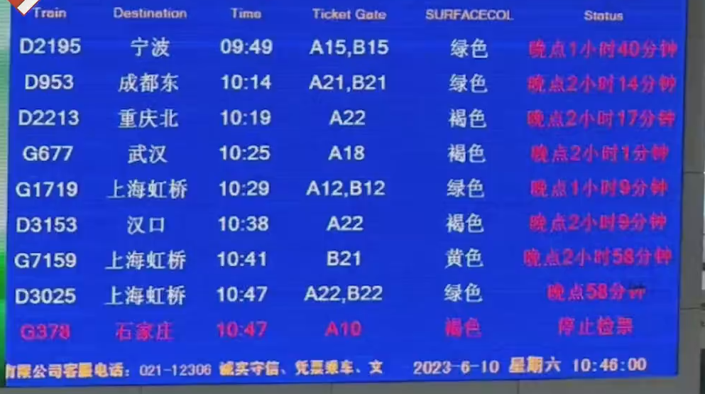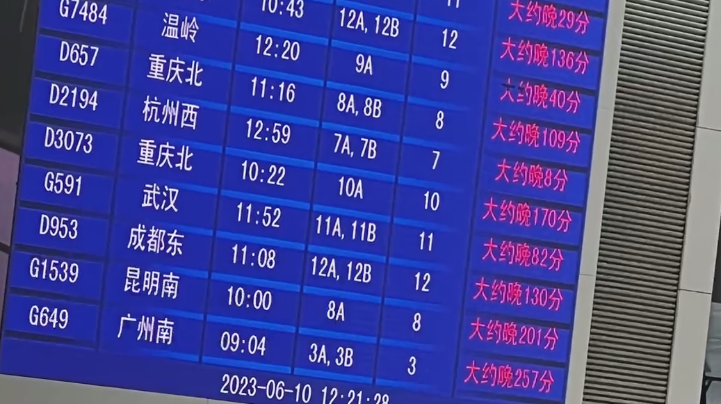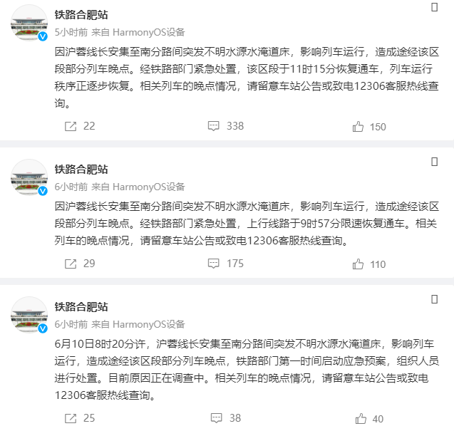6月10日,江苏、安徽等地多列开往合肥方向的高铁列车出现晚点。晚点时间不等,从几分钟到三四个小时都有,G649次甚至达到了257分钟,也就是几乎4个半小时。据铁路合肥站官方消息,沪蓉线长安集至南分路间突发不明水源水淹道床,影响列车运行,造成途经该区段部分列车晚点。