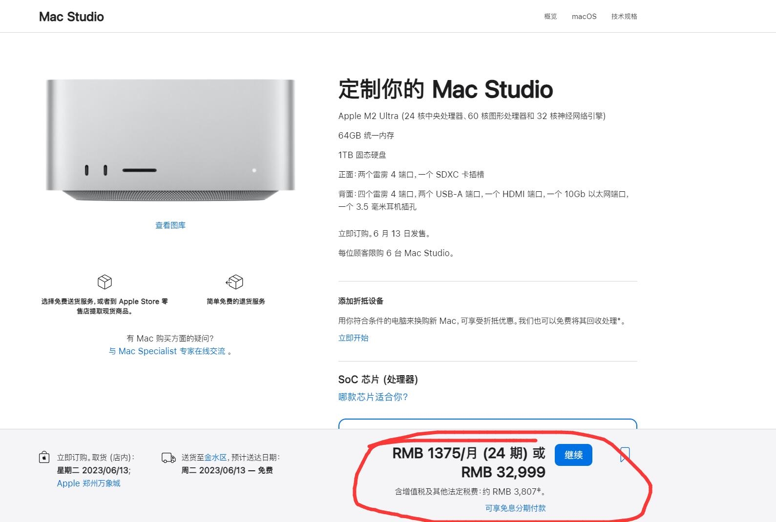 苹果Mac Studio将于6月13日正式开卖,M2 Ultra版本最低要32999元。值得注意的是,M2 Ultra芯片有两个版本,标准版是24核中央处理器、60核图形处理器、32核神经网络引擎,高配版是24核中央处理器、76核图形处理器核32核神经网络引擎,高配版比标准版贵了7500元。