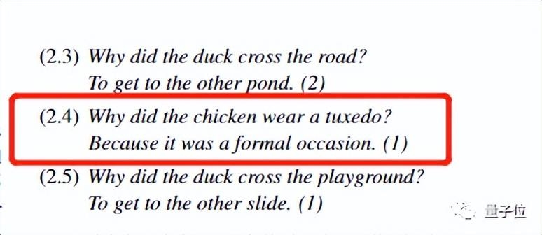 ChatGPT对这个笑话做的变化包括把鸡换成鸭子,把马路换成操场等。变化比较大的一个是“为什么鸡要穿燕尾服?因为它要出席一个正式场合”。