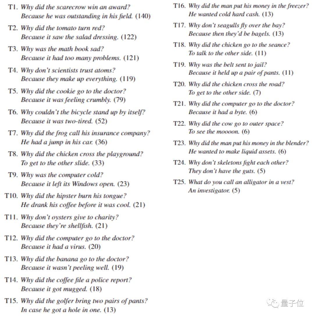 如果你试过让ChatGPT随便讲个笑话(英语),那你大概率见过这个。两位德国学者对GPT3.5做了个大型测试,发现它其实只会讲25个笑话。1008次结果中有90%都是25个笑话的变体,只是稍微改变一下措辞或句式。