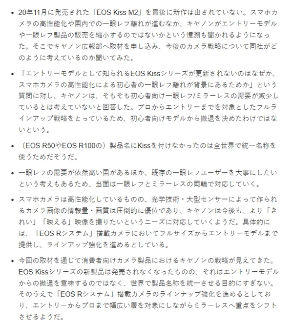 但是,佳能方面表示,它不认为初学者对单反相机的需求在下降。 而且,由于该公司拥有从专业人士到入门的全阵容策略,因此尚未决定退出初学者模式。与此同时,佳能明确表示,因为一些国家的市场仍然对于单反相机有很大的需求,而且基于照顾现有单反相机用户的情绪,佳能仍然将同时保持无反和单反产品线。