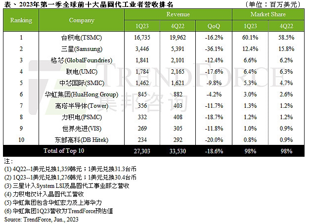 去年下半年全球半导体市场进入了熊市周期,PC、手机及数据中心等市场需求下滑,晶圆代工市场也难逃一劫,今年Q1季度中该市场营收环比下滑了18.6%,市场规模约为273亿美元。