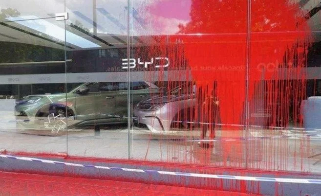据香港媒体报道,6月12日凌晨,中国电动车生产商比亚迪在香港的4家陈列室与服务中心,被发现遭人泼红漆、撞闸门等破坏。这4家店分别位于尖沙咀中晶金融中心、元朗雄伟工业大厦、湾仔和天水围。