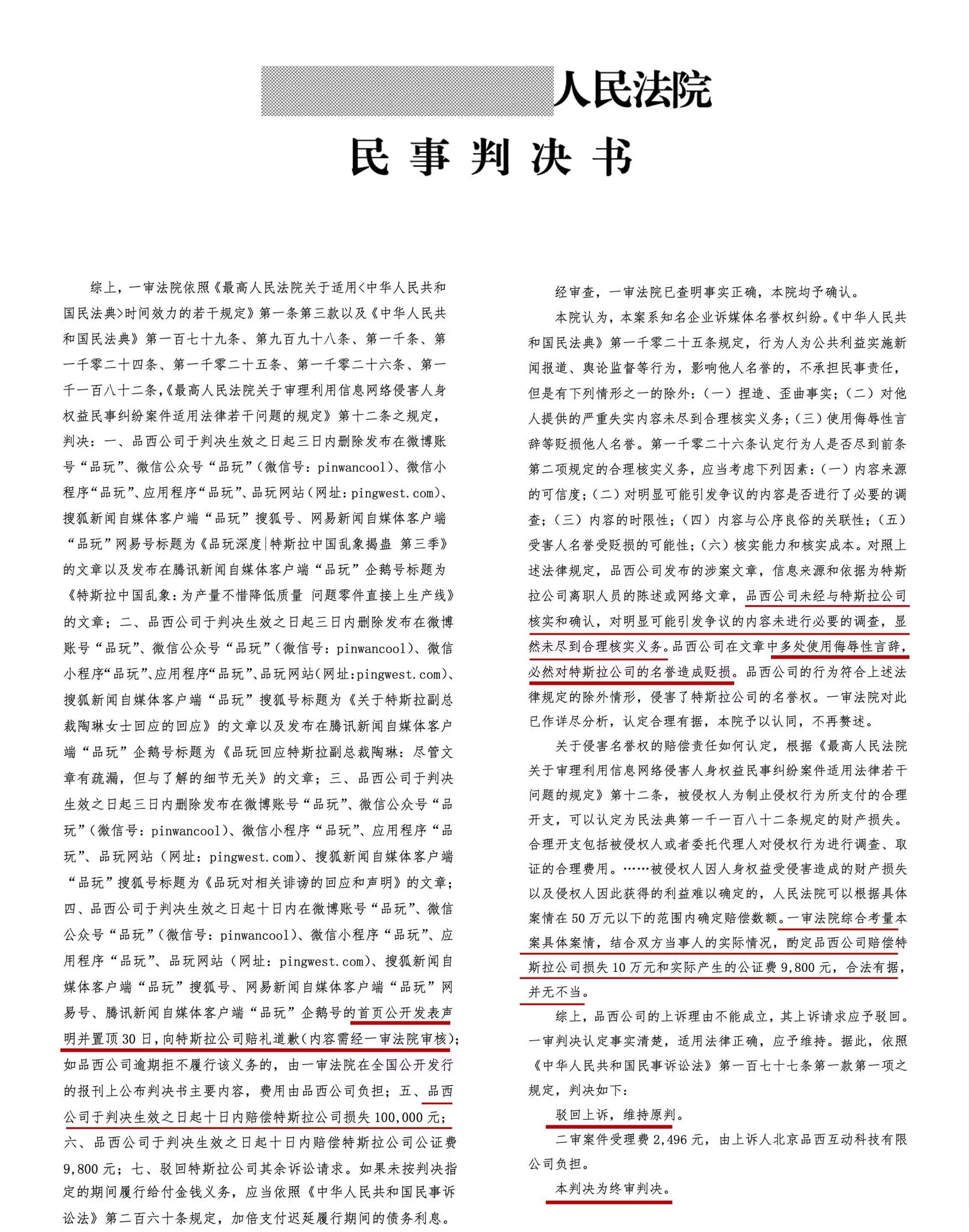 一审判处品玩删除其在8个社交平台上发布的侵权文章,在各平台首页发表书面道歉,并向特斯拉赔偿经济损失10万元。