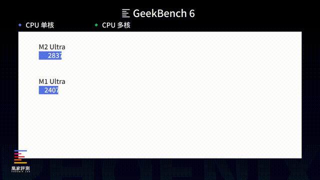 还是先来Bench Mark的理论性能测试。在GeekBench 6中,M2 Ultra的单核得分2837分,相比M1 Ultra提升了约18%;多核得分21730分,相比M1 Ultra提升了约16%。