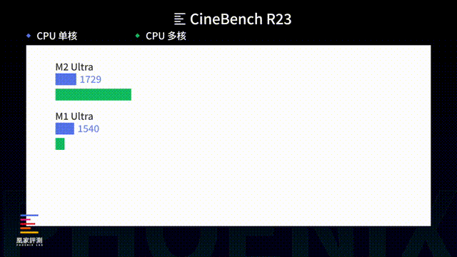 在CineBench R23测试中,单核1729分,多核28825分的成绩,相比M1 Ultra分别提升了12%以及21%。