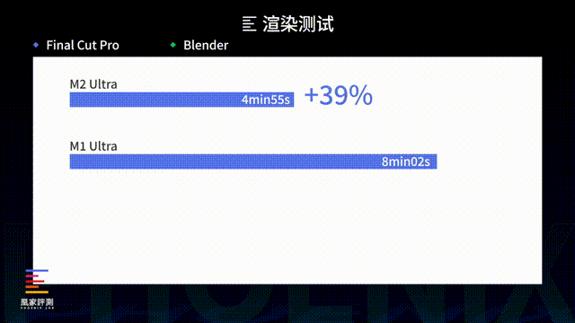 Final Cut Pro的视频渲染测试我们用了在三亚体验Apple Watch的这个将近1TB的视频工程文件进行,调色、插件、特效这些也跟我们最终的实际成片保持了一致。同为128GB内存,渲染输出这支20分45秒的视频,M2 Ultra总共用了4分55秒,相比M1 Ultra的8分02秒有了39%的速度提升,不得不说出片效率又有提升了!不过这可能不是我们剪辑小哥想看到的结果