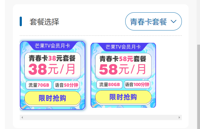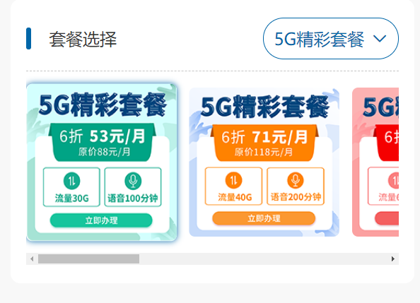 携入套餐目前可选5G精彩套餐和青春卡套餐,前者提供53元、71元、95元、113元、137元不等套餐,对应流量也不同,后者则提供38元和58元的套餐。