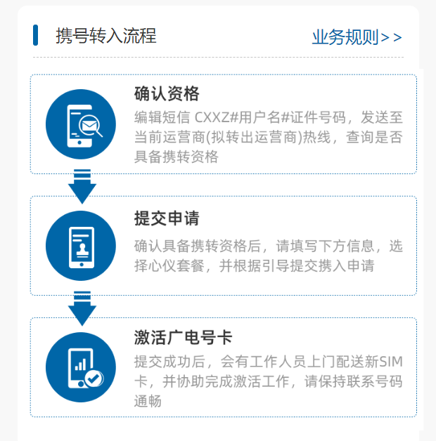 据了解,打算携号转入中国广电的用户需要先确认携转资格,可编辑短信内容“CXXZ#用户名#证件号码”,发送至拟转出的运营商热线,查询是否符合携转资格。