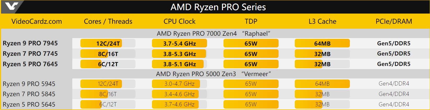 锐龙Pro 7000处理器主要有3款,分别是锐龙9 Pro 7945、锐龙7 Pro 7745及锐龙5 Pro 7645,都是65W TDP功耗,但核心数分别是12核、8核及6核。