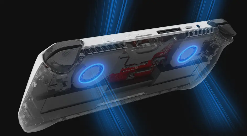 在整机的堆叠设计上,ROG掌机搭载冰川散热架构掌机版,采用双风扇设计,风扇采用了液态轴承设计,稳定性高,噪音更低。散热热管内部将毛细结构重新排列,相比普通热管可增加18%毛细作用。出风口覆盖0.1mm冰翼鳍片,根据官方数据,在室温23℃情况下,握持区域温度为30-33℃。整机重量608g。