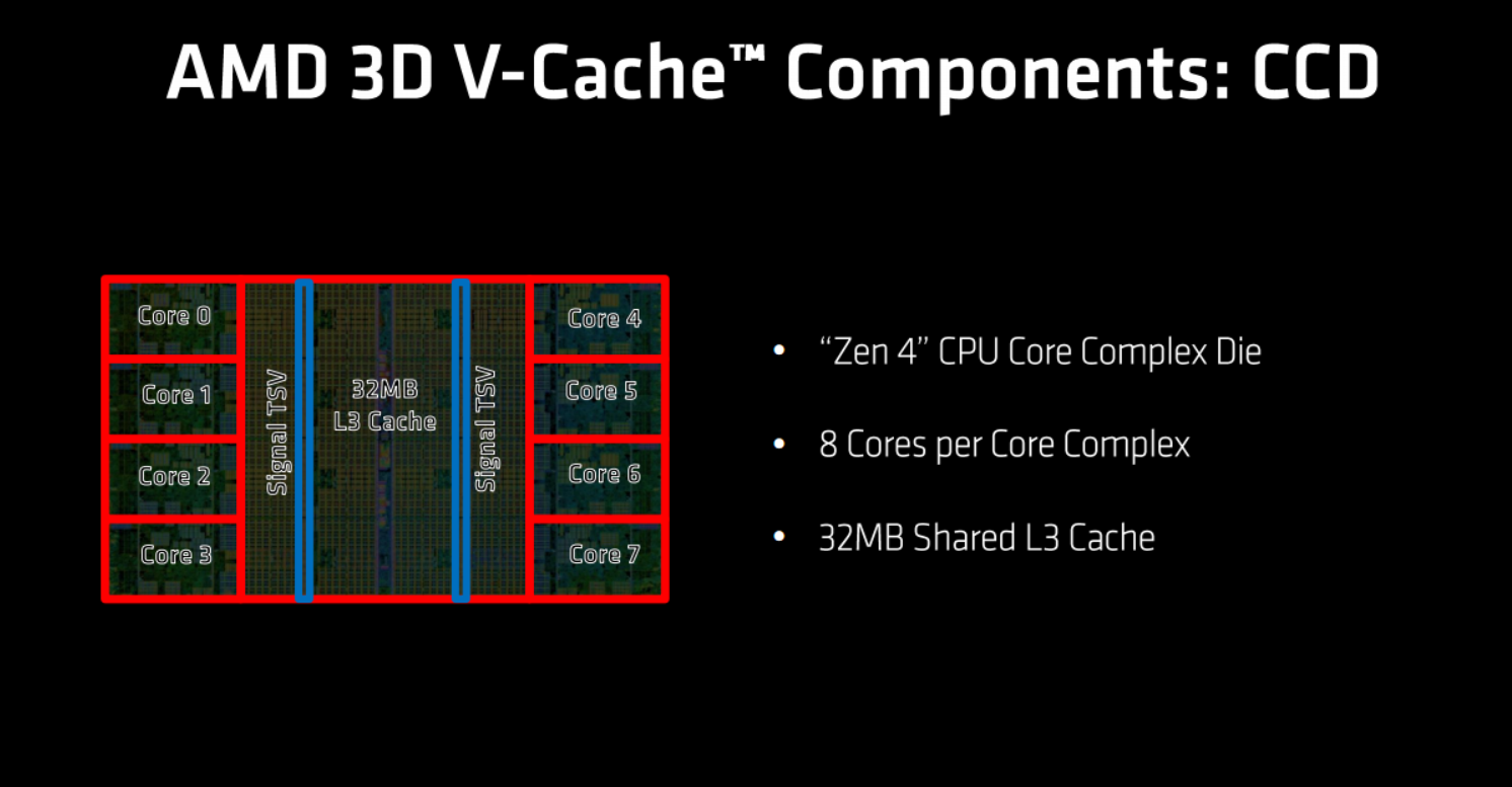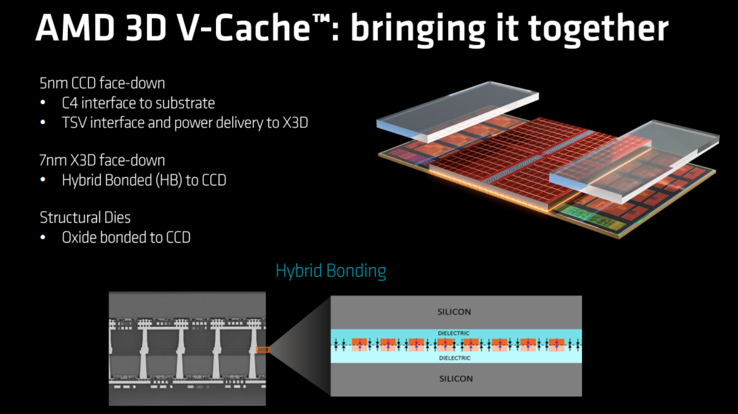 3D缓存部分“面朝下”扣在5nm制造工艺的CCD之上,通过混合键合的方式组合成一个整体,通过TSV硅穿孔提供信号、电源传输通道。