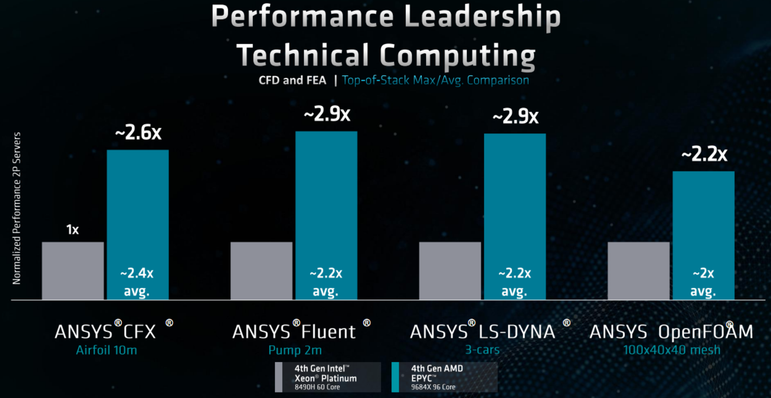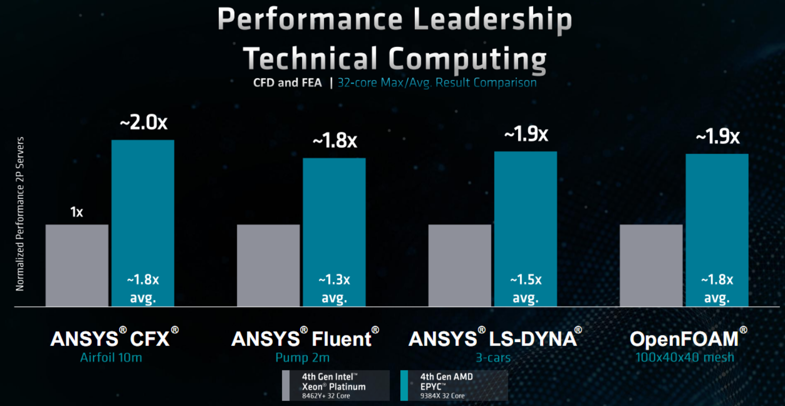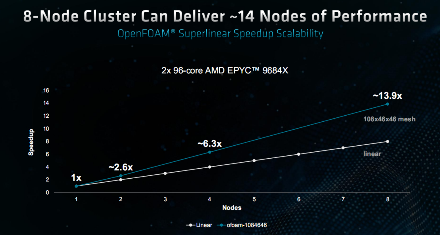 得益于超多核心、超大缓存两大优势集于一体,Genoa-X系列实现了超高的计算密度,而且多处理器互连的效率非常高,几乎可以呈线性提升。