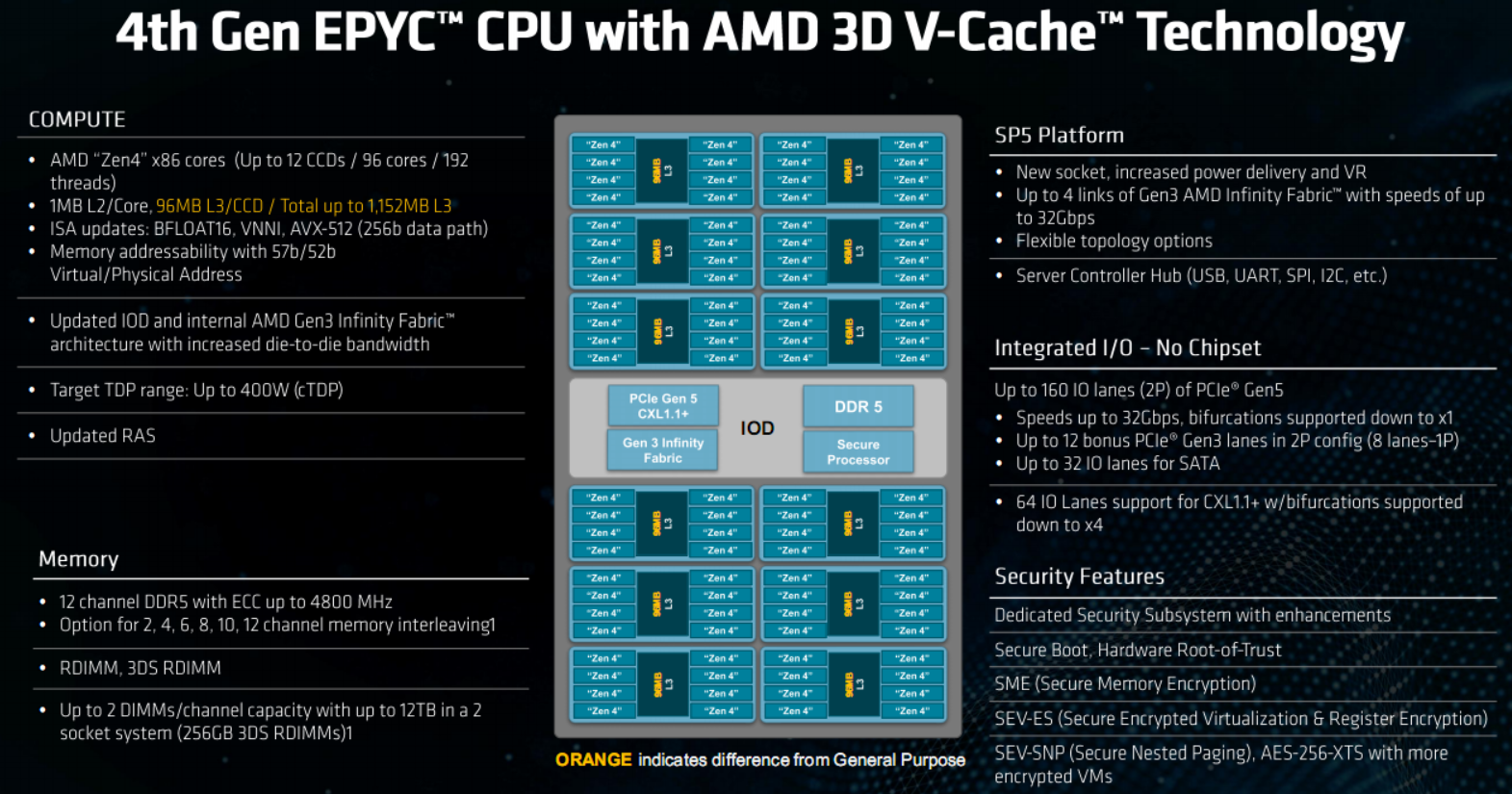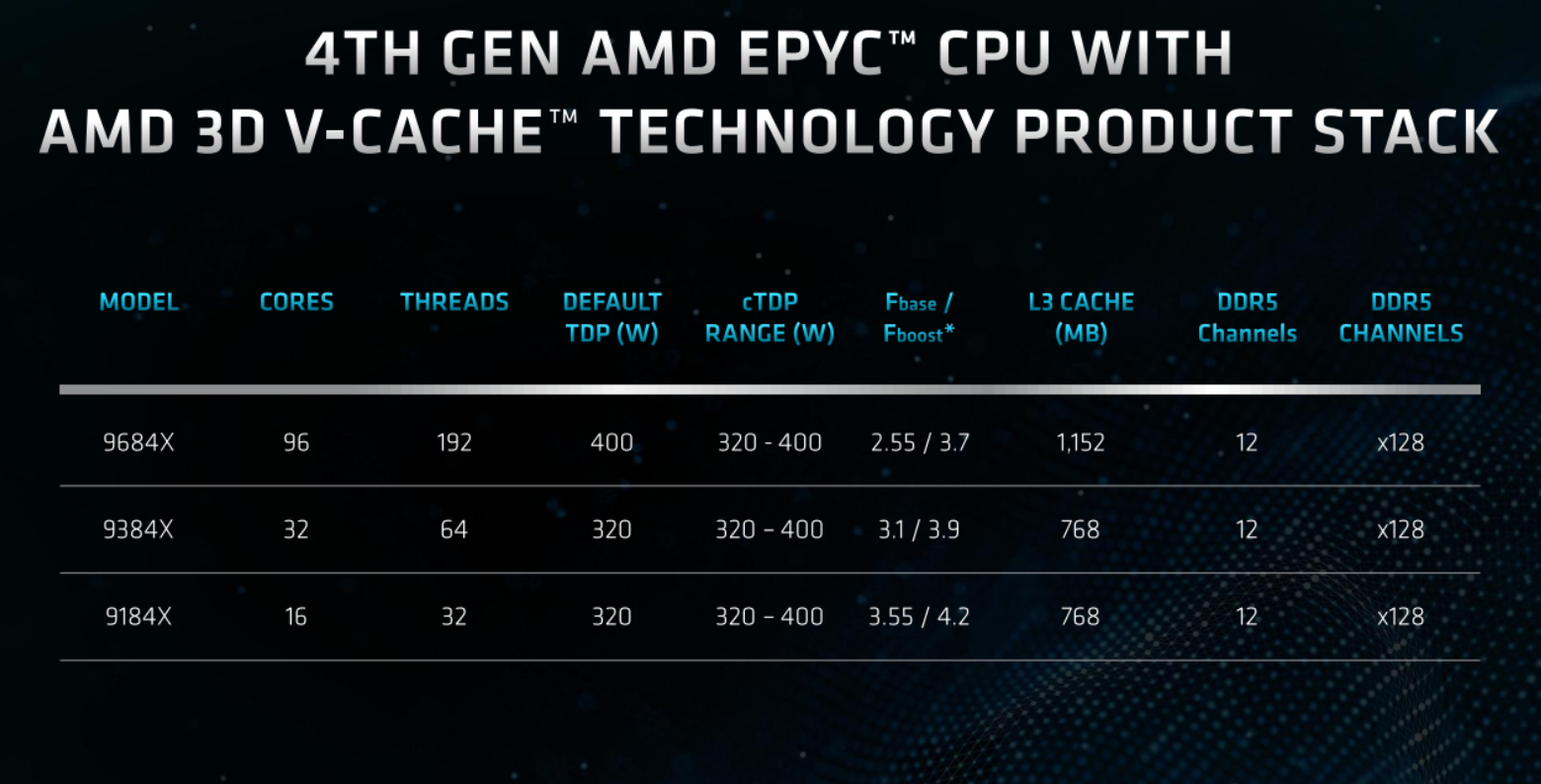 首先,Genoa-X系列上使用的3D V-Cache技术,从原理到实现方式都和上代Milan-X系列,以及桌面上的锐龙7 5800X3D、锐龙7000X3D如出一辙。