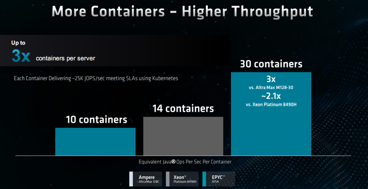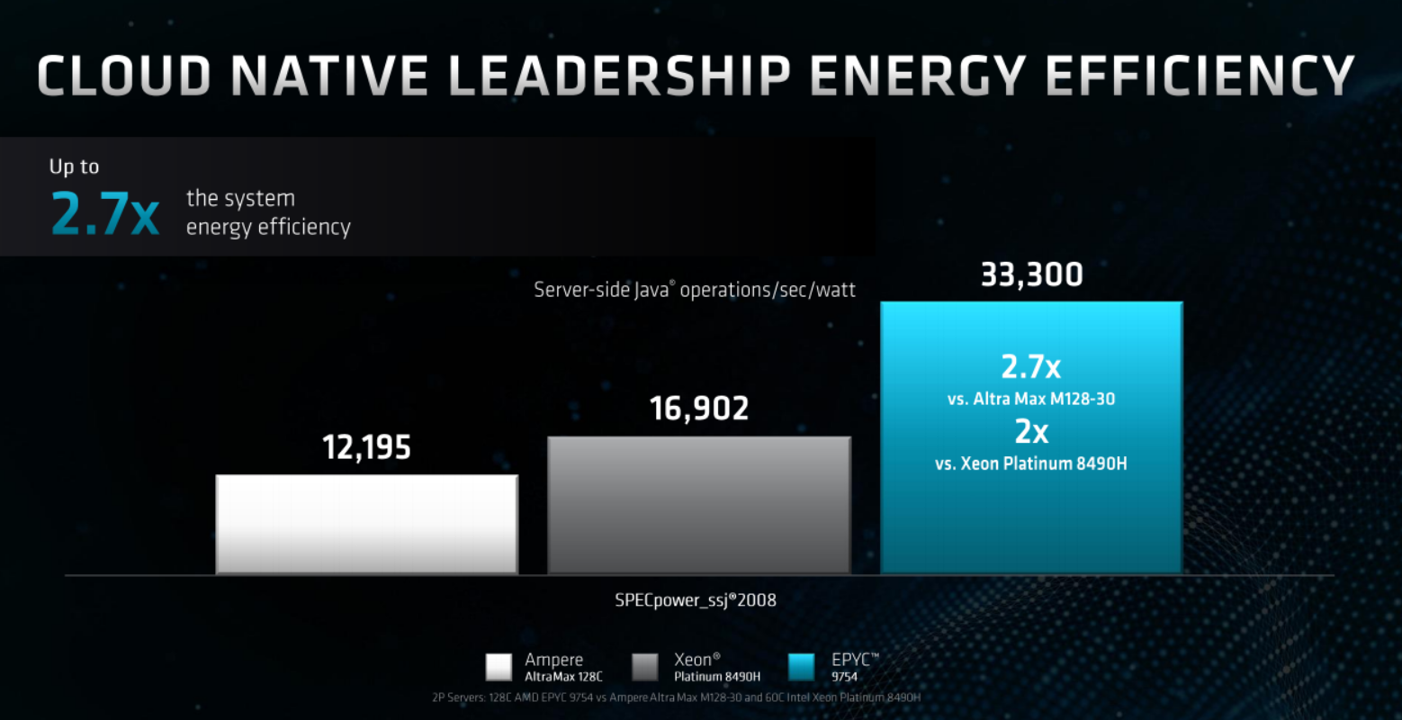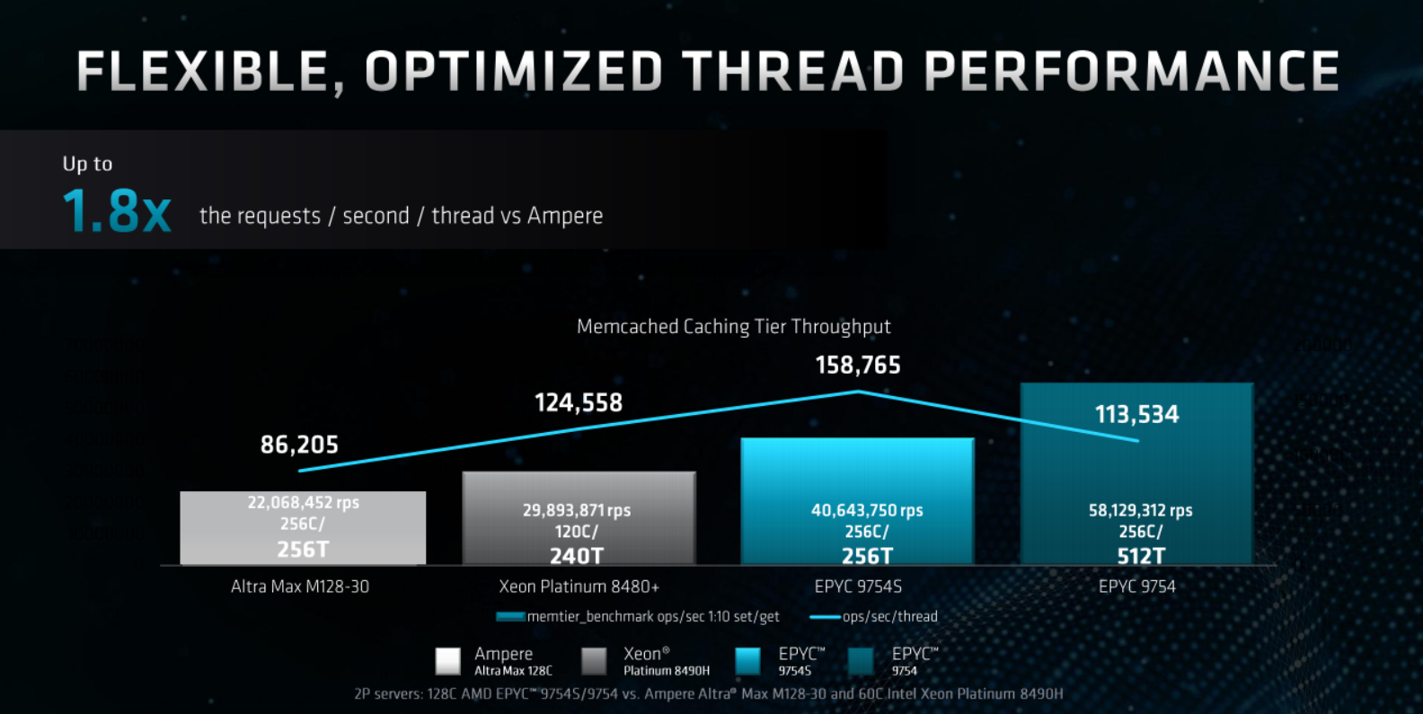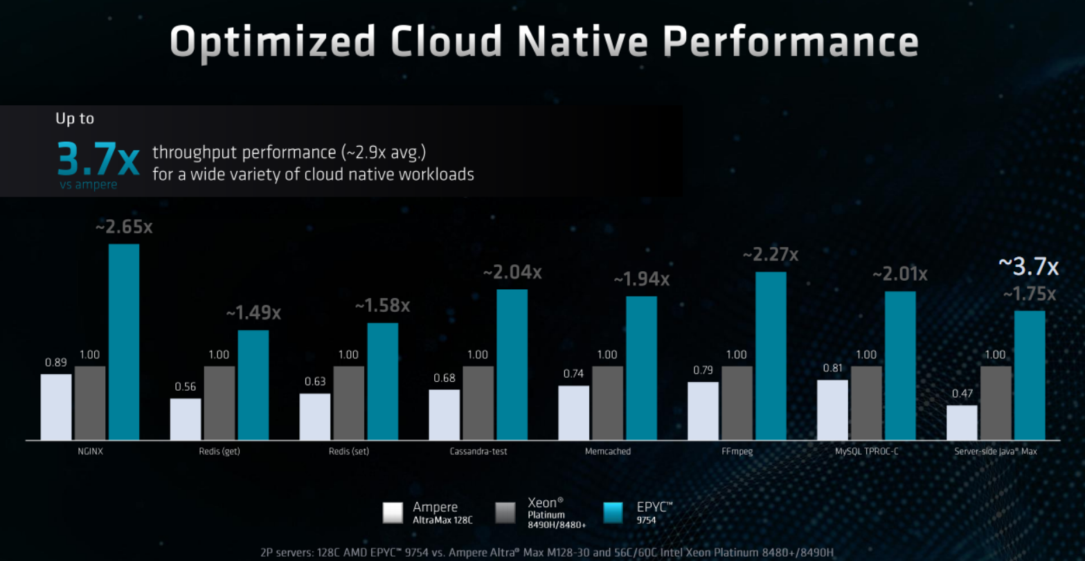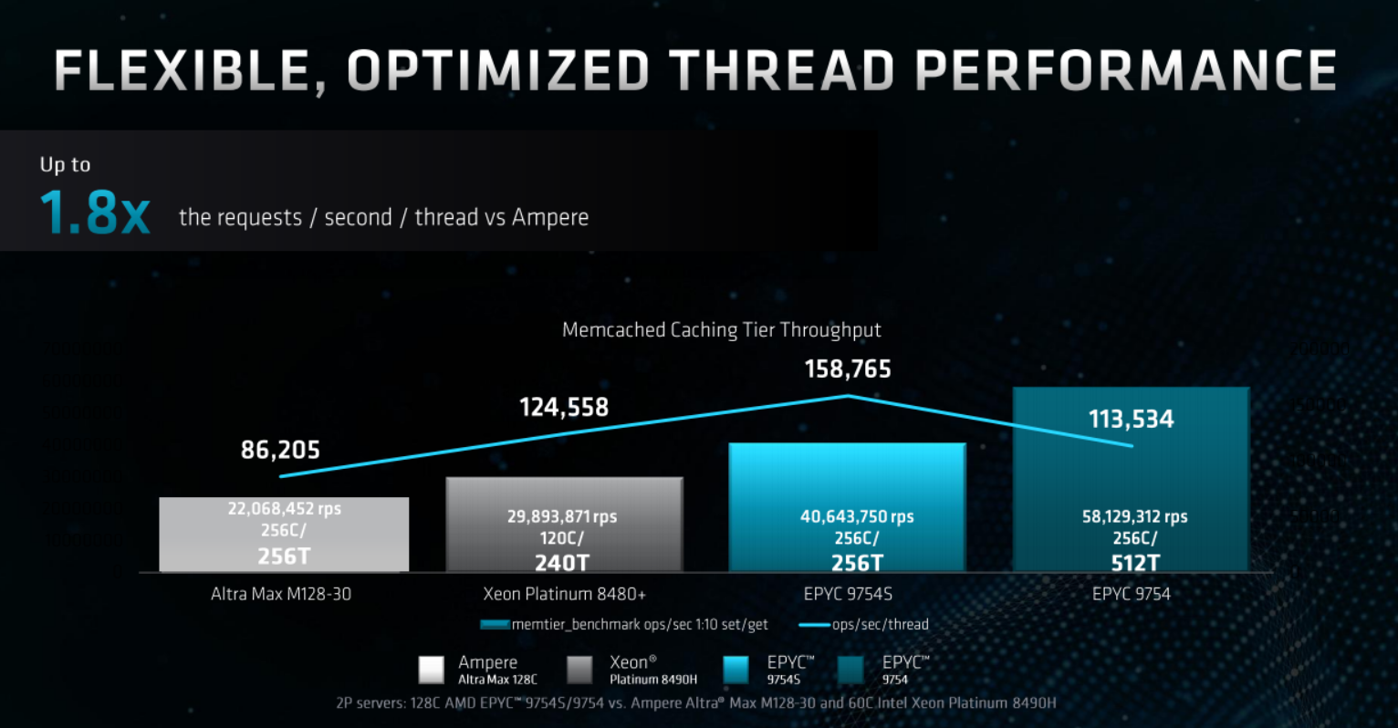 性能方面,AMD使用EPYC 9754,对比了两个竞品,一是Intel最新一代旗舰Sapphire Rapids四代可扩展至强铂金8490H,后者有60核心120线程、112.5MB三级缓存、1.9-3.5GHz频率,热设计功耗350W,二是Ampere AltraMax,128核心(更新的AltraOne最高可以192核心但尚未上市)。