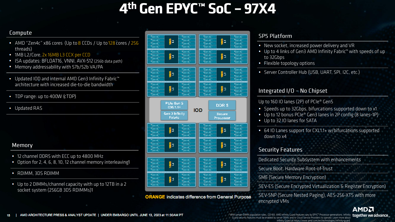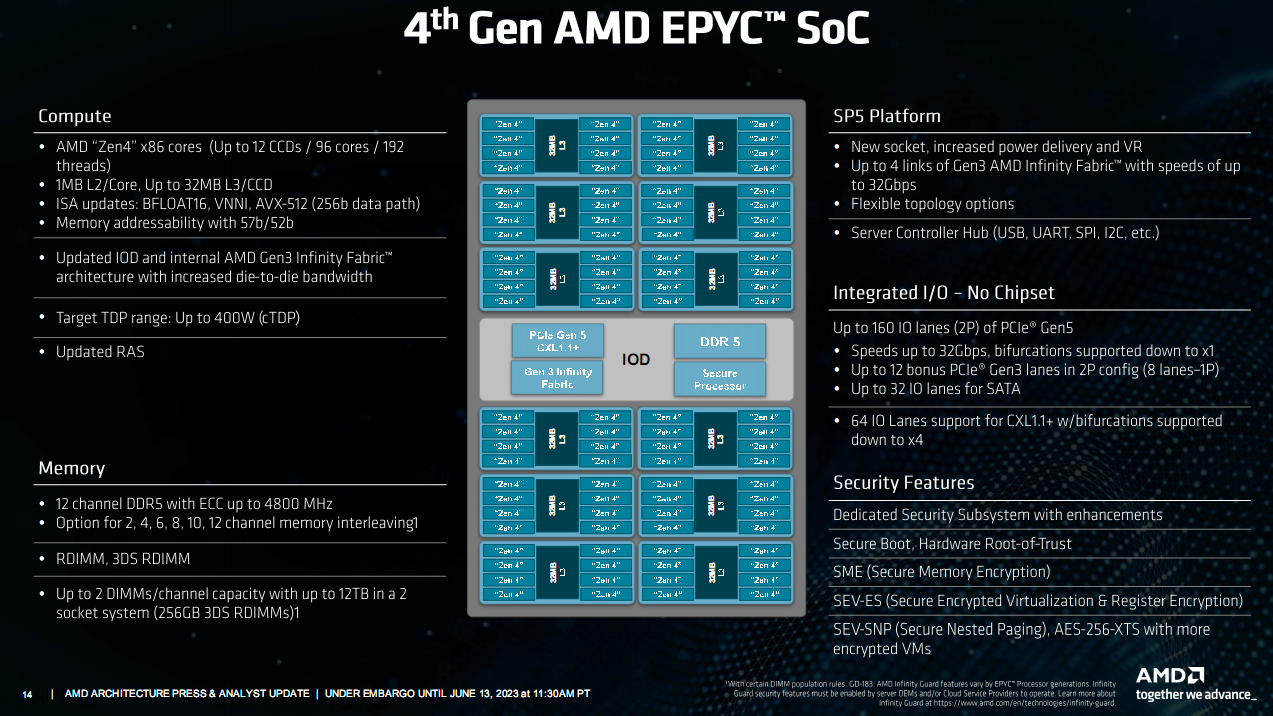同样的5nm制造工艺,同样的12通道DDR5内存、160条PCIe 5.0总线,同样的安全特性,同样的SP5封装接口。