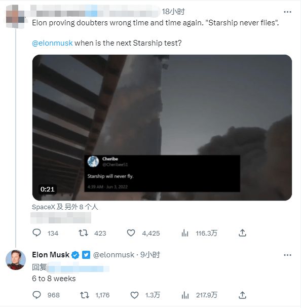 马斯克在推特上回应有关星际飞船最新进展时表示,下一次测试将在“6到8周内”进行。