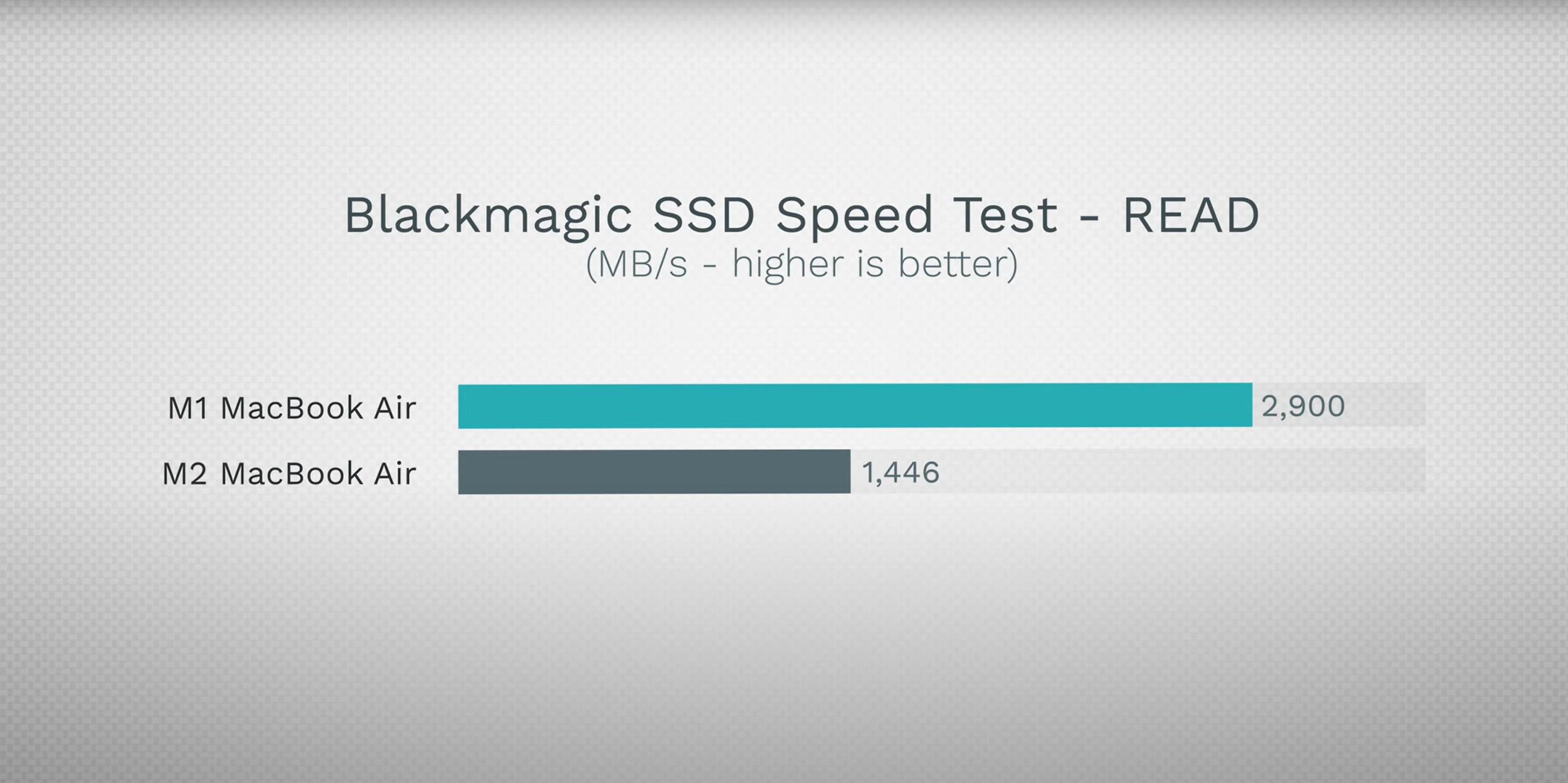 在本月举行的苹果WWDC2023开发者大会上,苹果正式推出15英寸MacBook Air,起售价是10499元(8GB+256GB),目前已经上市发售。有博主已经拿到了15英寸MacBook Air,发现256GB版本固态硬盘的性能要比M1版差很多。经测试,搭载M2芯片的15英寸MacBook Air SSD速度是1446MB/s,相比之下,M1版本的速度达到了2900MB/s。