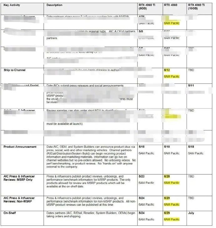 最新消息称,RTX 4060预计最快会在6月29日上市。根据曝光的表格,RTX 4060非Ti版定于6月29日发布,近期已经开始向渠道发货。已知具体的时间节点如下: