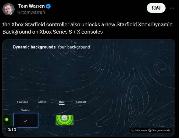 根据 The Verge 编辑 Tom Warren 报道,一旦用户将他们的《星空》定制版本连接到他们的 XboxSeries X|S 主机上,他们就会自动解锁一个新的动态背景,名为“星空”,可以通过主机的设置菜单更改。
