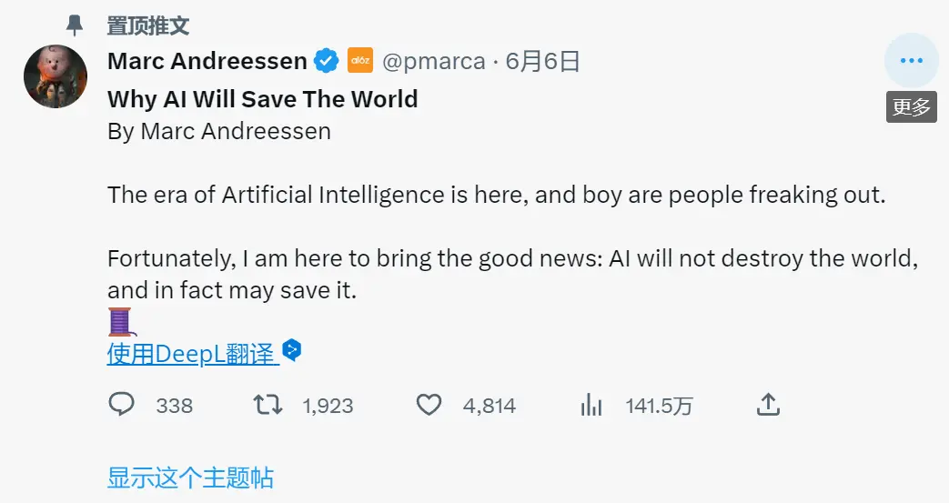 马克·安德森自称 “AI 加速主义者(AI accelerationist)”。