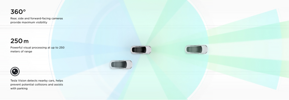 当年5月,特斯拉就宣布从当月开始交付的所有Model 3和Model Y,将用特斯拉的纯视觉系统,摘了雷达,这意味着特斯拉的自动驾驶系统将完全依赖基于相机的视觉处理,每辆特斯拉都配备 8 个外部摄像头来监测周围环境。