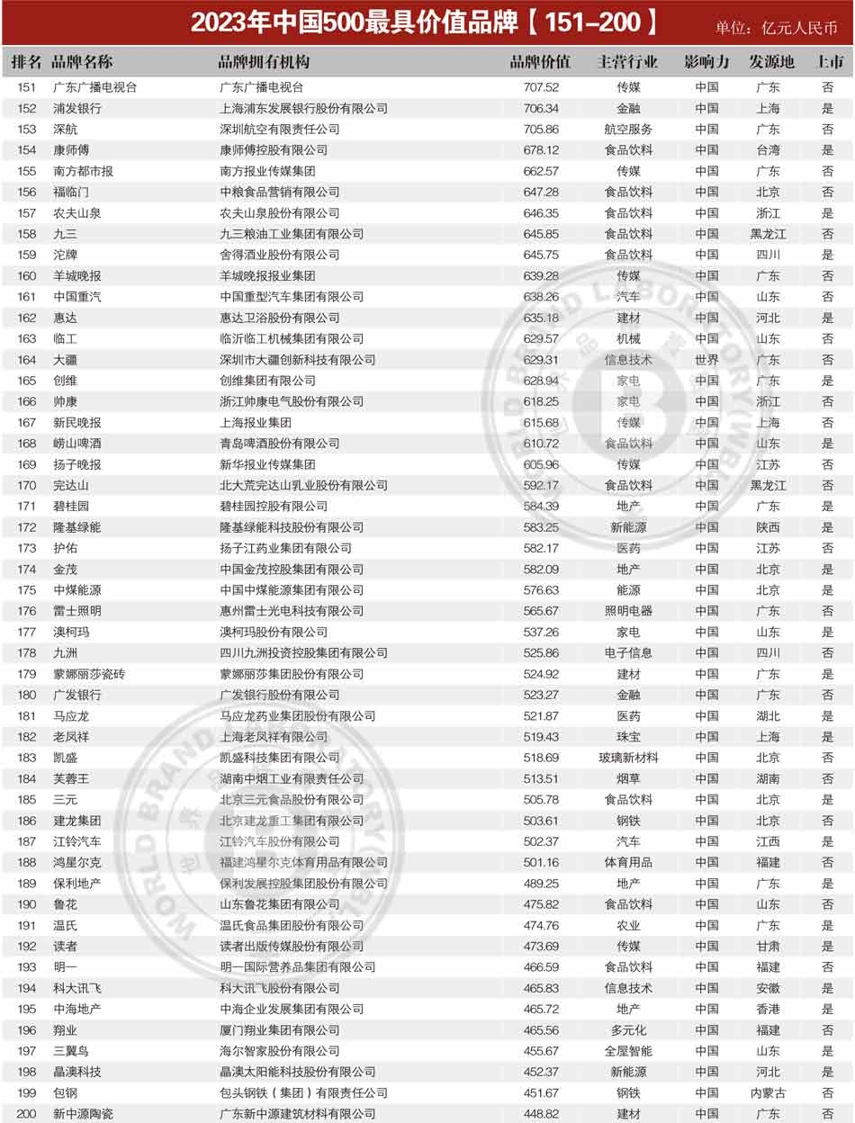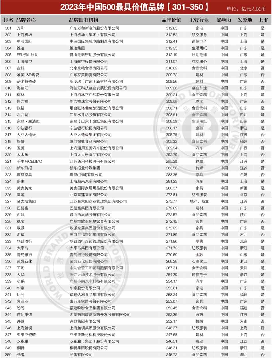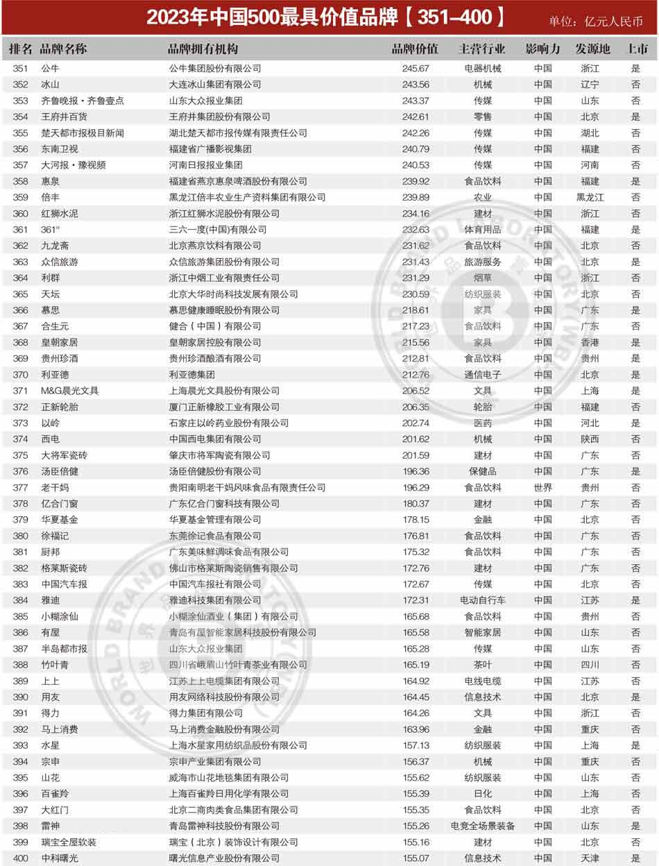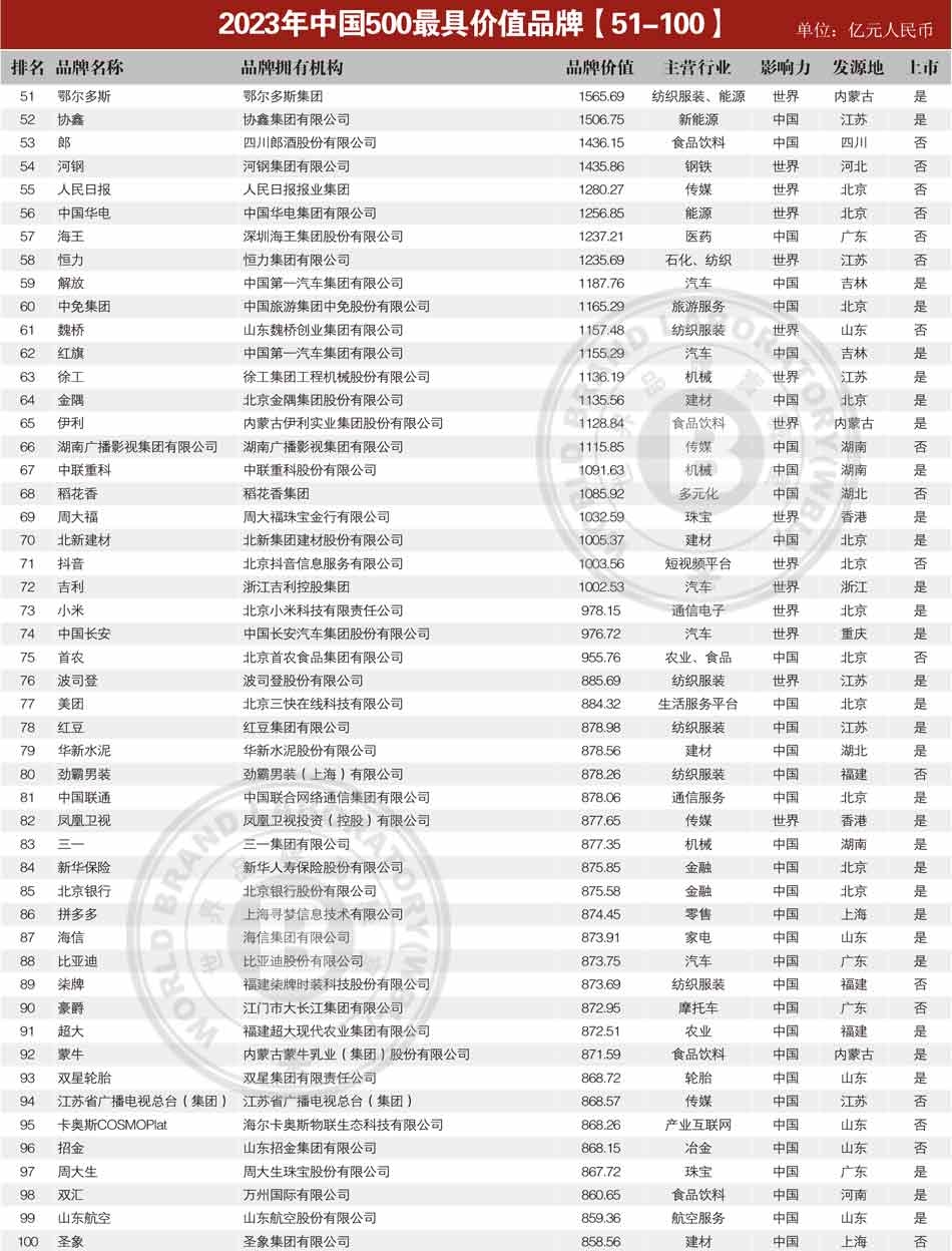 世界品牌实验室(World Brand Lab)今天发布2023年《中国500最具价值品牌》分析报告。2023年《中国500最具价值品牌》的总价值为343311.81亿元,比去年增幅10.84%。平均价值高达686.62亿元,入选门槛35.27亿元。