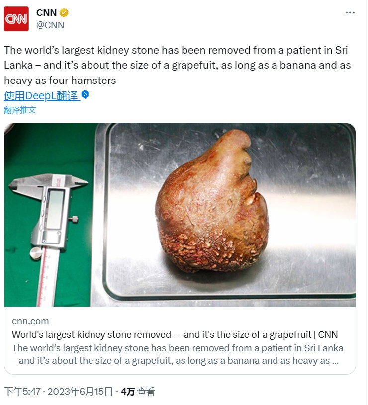 6月15日消息,不爱喝水的朋友注意了,近日,世界最大的肾结石出现了,着实让人震惊了一把。斯里兰卡军医于本月1日在科伦坡陆军医院进行了一次大手术,移除了世界上最大、最重的肾结石,这颗结石已被吉尼斯世界纪录官方认证为“世界上最大的肾结石”。