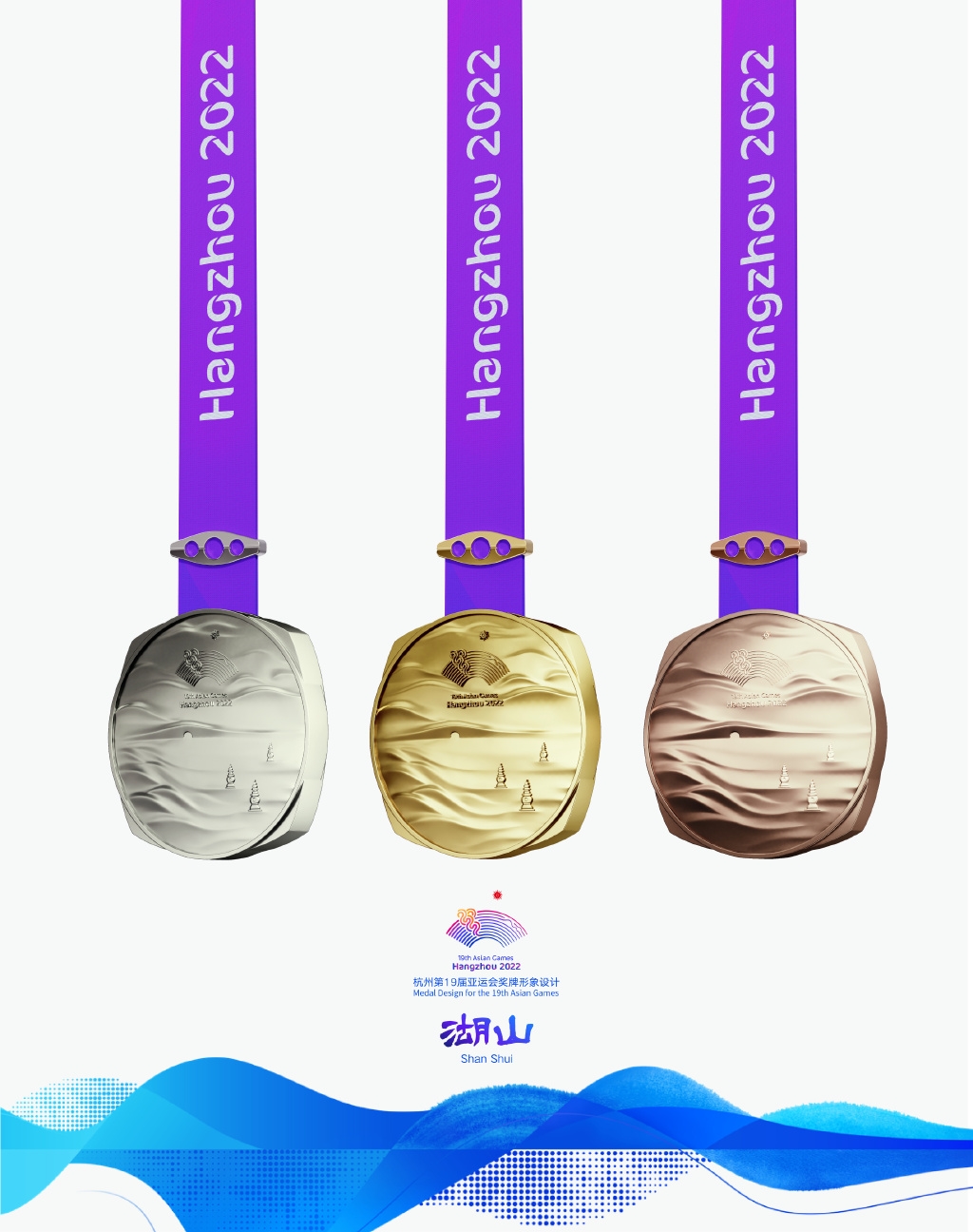 “湖山”背面则刻有本次亚运会的名称和亚奥理事会的太阳会徽,整体形似方形印章,寓意运动员们在杭州亚运会上留下美好的印记。