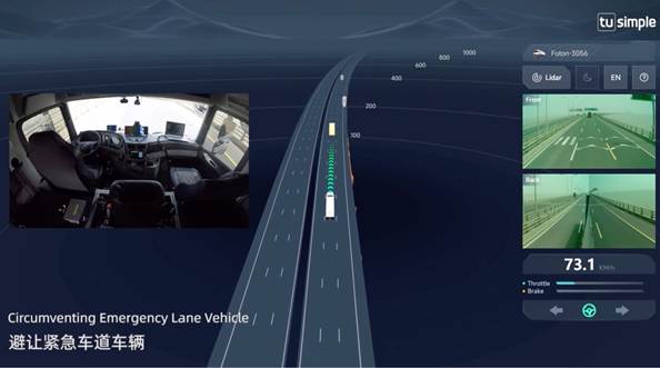 图森未来自动驾驶卡车在实际道路中可以应对交通信号灯识别、上下匝道、变道行驶、避让紧急车道车辆、应对车道部分封路和大雾侧风天气等场景。