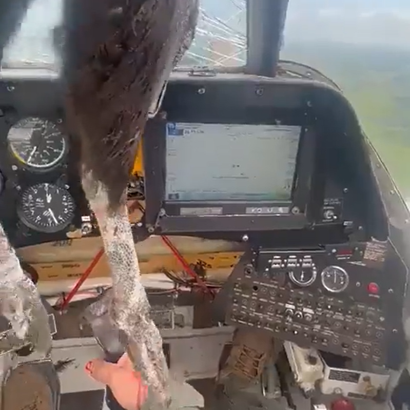 从其视频中可以看到,这只大鸟将飞机的前挡风玻璃撞破后,头部卡在玻璃上,身体悬吊在飞机驾舱内,而飞行员的脸上被溅满了鲜血,衣服上也有不少血迹,看起来非常骇人,好在飞行员足够沉着冷静,最终有惊无险。