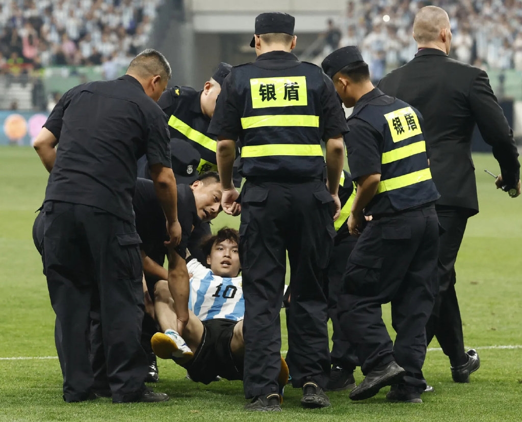 在昨晚的阿根廷与澳大利亚比赛上,除了梅西之外,最亮眼的可能就是那位冲进赛场的小伙了。他在比赛第61分钟时激动的冲进场内拥抱了梅西,并且速度极快的连续躲避多名保安,还和大马丁击了个掌,一度导致比赛中断。