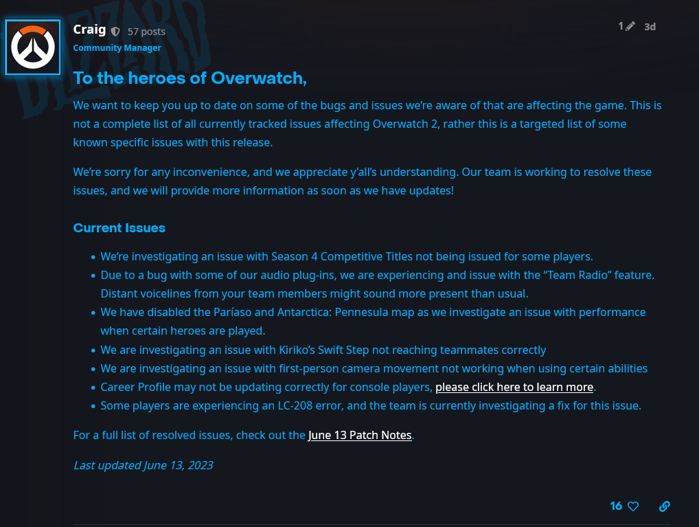 在本周官方论坛发布的游戏已知问题更新主题帖子中,《守望先锋2》的开发团队写道:“我们已经禁用了帕拉伊苏(Paríaso)和南极洲:半岛(Antarctica:Pennesula)地图,我们正在调查使用某些英雄游玩时会发生的游戏性能问题。”