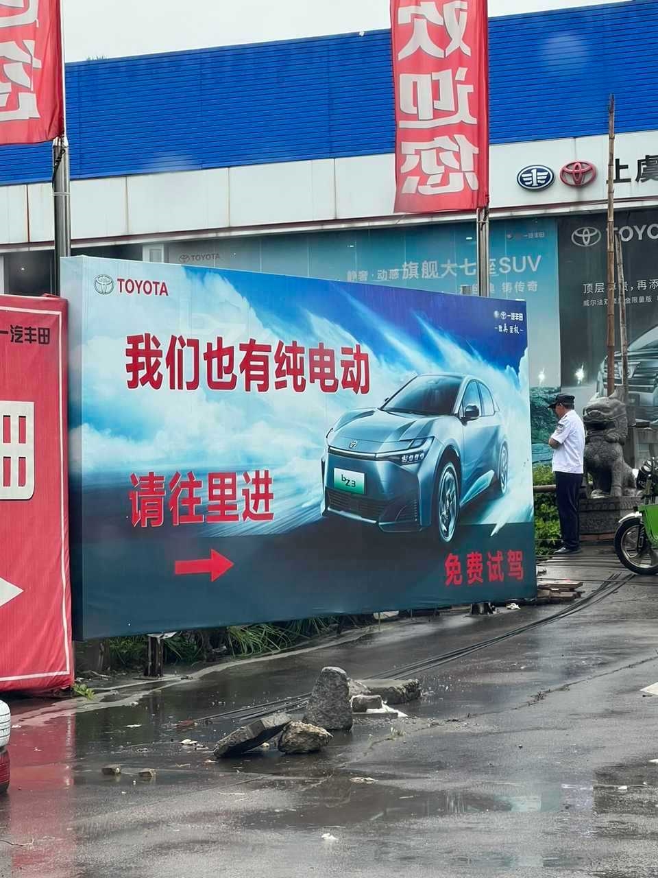 近日,有网友拍到了当地丰田4S挂出的广告招牌,在非常醒目的位置,上面是一台丰田bZ3的照片,配的文字为“我们也有纯电动,请往里进,免费试驾”之类的字样。